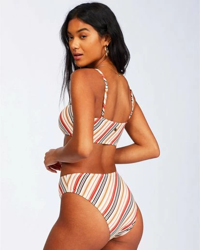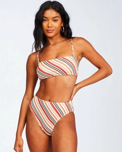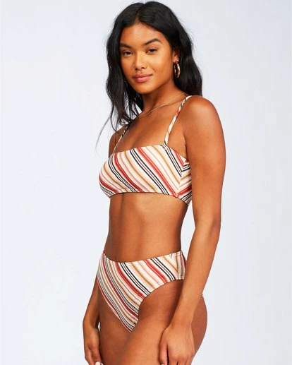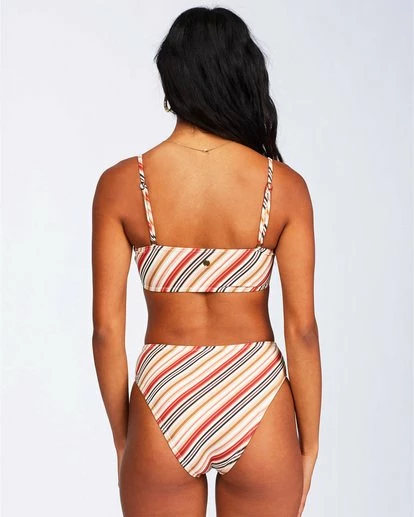 Taking classic tan lines in a new direction, the Above It All stands out with diagonal stripes in sunburnt tones. A striped bikini top made from rib knit swim fabric, the Strappy Tank features a straight bralette silhouette with adjustable shoulder straps and a pullover style.