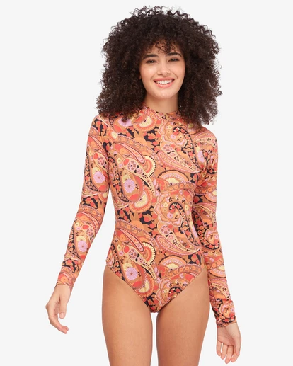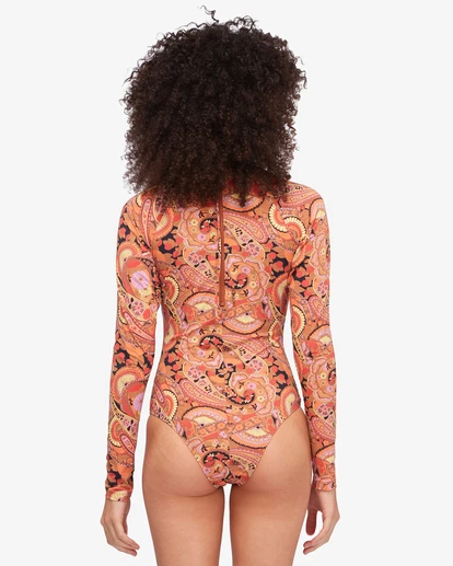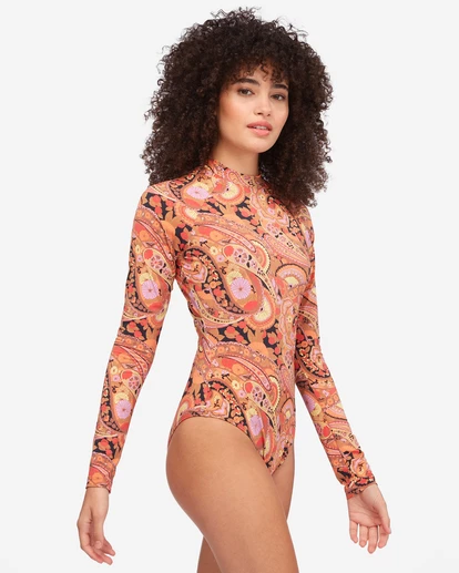Sprinkle a little retro spirit on your Lost In Time Zip Long Sleeve Swimsuit. Made with recycled stretch materials, this eco-conscious surf suit offers a solid range of movement and a flexible fit with long sleeves for enhanced sun protection. An all-over print channels days gone by, and the cheeky bum cute gives you a nice shape from behind. The fit is classic with a zipper at the back for easy on and off.