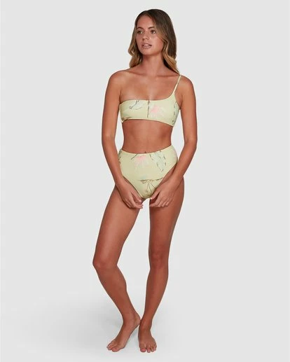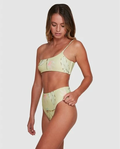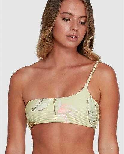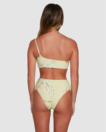 An upgrade to your average swim style, the Maui Babe One Shoulder Bikini Top brings us a bralette design with a modern twist. Made entirely from a recycled rib fabrication, this top displays a beautiful tropical print that has us dreaming of our next holiday destination. Featuring clean finished edges and adjustable shoulder straps for a sleek and flattering fit. Finished with side seam boning and removable padding.