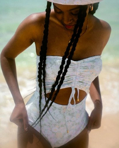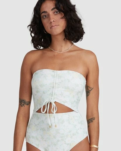 A one piece swim suit that hits all the right notes, the Melody Bandeau features a draw cord front bust detail with a cut out midriff. The women’s one piece offers a mid-rise leg opening with regular bum coverage. Made with recycled fabrics, the suit offers internal shelf bra with removable padding and full lining.